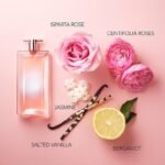 The fragrance opens with a fresh, fruity burst of bergamot and pear, enhanced by a touch of pink peppercorn for a vibrant start. The heart unfolds into a captivating floral bouquet of rose essence and jasmine, exuding timeless femininity. Finally, the base notes of vanilla, white musk, patchouli, and cedarwood create a warm and sensual trail that lingers beautifully.